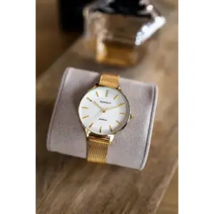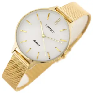 A Perfect női karóra elegáns, időtálló megjelenést kínál a mindennapokra és alkalmi viselethez is. Az arany színű tok és fém szíj harmonikusan illeszkedik az ezüst színű számlaphoz, így könnyen kombinálható különféle öltözékekkel.