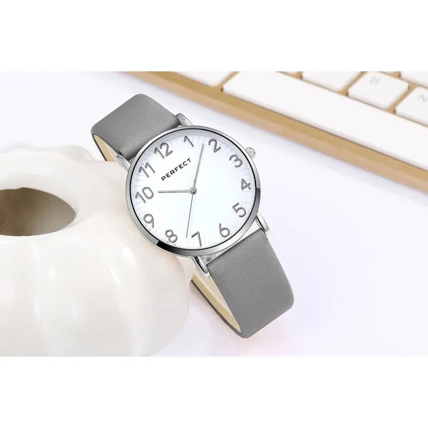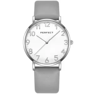 Perfect női kvarc karóra, ezüst számlap, szürke bőrszíj, 36 mm