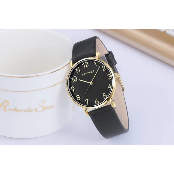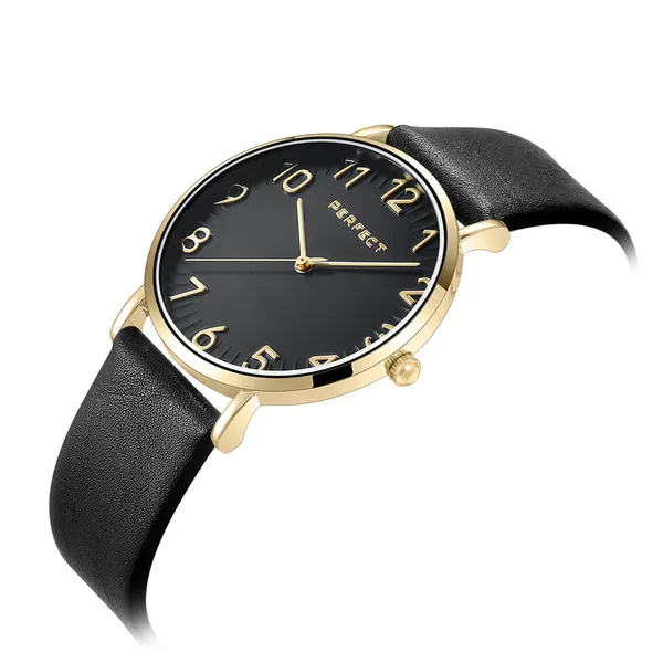 A Perfect női karóra elegáns, időtálló választás a mindennapokra és alkalmi viselethez is. A fekete számlap, az aranyszínű tok és a fekete bőrszíj harmonikus megjelenést ad, így könnyen kombinálható különböző öltözékekkel.