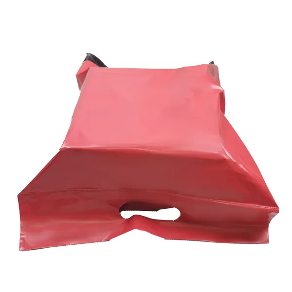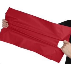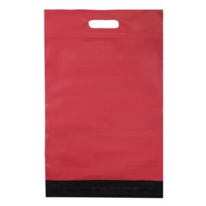 Piros futártasak fogantyúval, amely praktikus és biztonságos megoldás webáruházak, csomagküldők és üzleti feladások számára. A csomag könnyebb hordozását a beépített fogantyú segíti, míg az öntapadós zárás gyors és megbízható csomagolást tesz lehetővé.