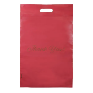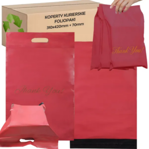 A piros LDPE futártasak praktikus „Thank You” felirattal és kényelmes füllel megkönnyíti a csomagok átadását.