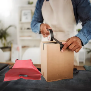 A fogantyú stabil fogást biztosít a futárnak és az átvevőnek, így nem kell külön táskát használni. A tasak síkban érkezik, ezért minimális helyet foglal a raktárban, és könnyedén kéznél tartható a csomagolóasztalon.
