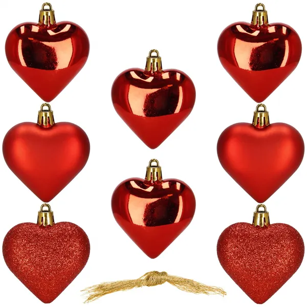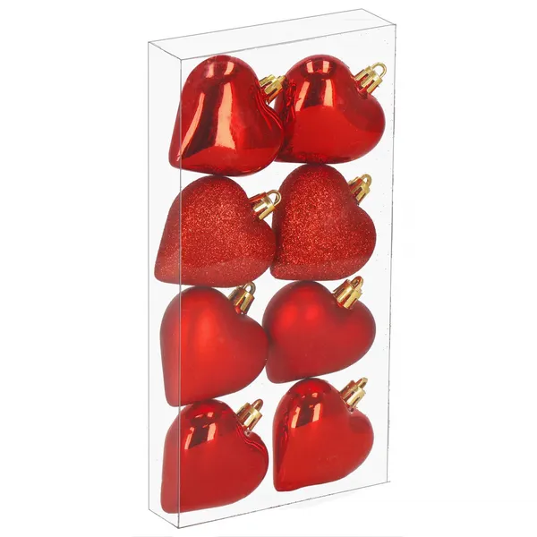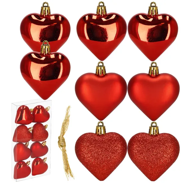 Piros szív alakú műanyag karácsonyfadísz szett, 8 db, 7 cm, törhetetlen