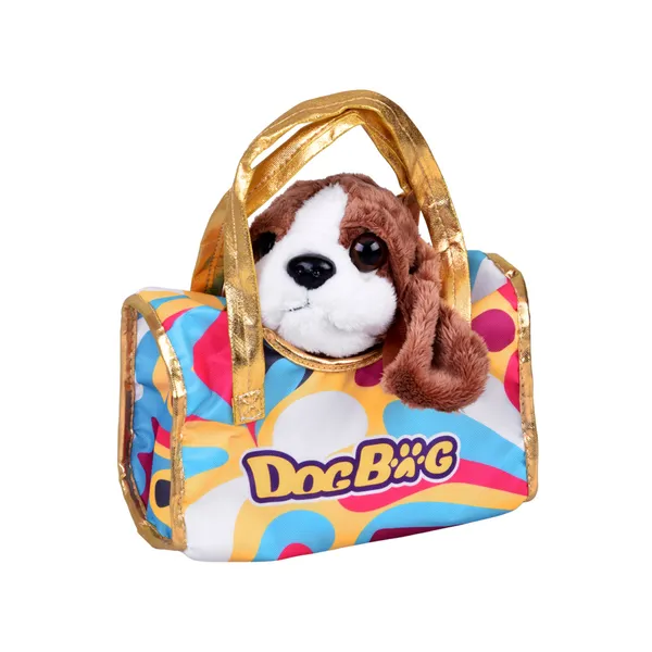 Plüss kiskutya hordtáskában, 18 cm, arany fülű színes táskával