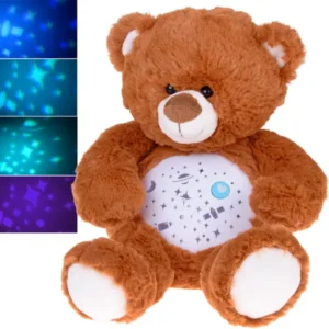 A bájos, 25 cm-es plüss maci csillagvetítővel és altatódalokkal segíti a babák nyugodt elalvását, miközben puha ölelésével biztonságot nyújt.