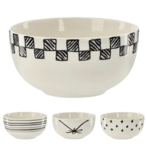 Elegáns fekete-fehér porcelán tálkészlet, amely 4 darab, egyenként 550 ml-es tálat kínál mindennapi étkezésekhez – leveshez, salátához vagy müzlihez egyaránt. Mosogatógépben és mikróban használható, így időt takarít meg, miközben modern megjelenést ad az asztalnak.