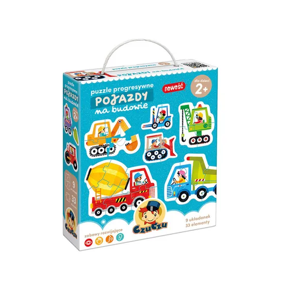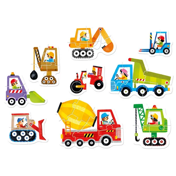 • 9 színes puzzle, összesen 33 elem – járművek építkezés közben