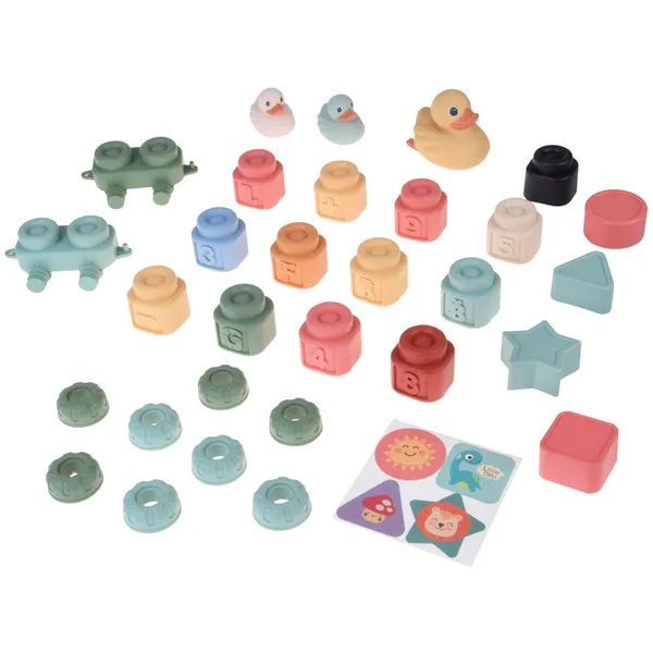 A 30 darabos, puha gumiblokk-készlet pasztell színei és kedves kacsái a legkisebbeket is játékra csábítják, miközben biztonságosan fejlesztik érzékszerveiket.