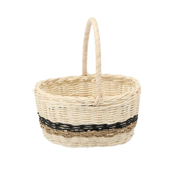 Természetes rattanból készült, füllel ellátott kosár, amely elegáns fehér-fekete-natúr színeivel bármely helyiségben rendet teremt és könnyen szállítható. Kompakt méretének köszönhetően polcokra és fiókokba is befér.