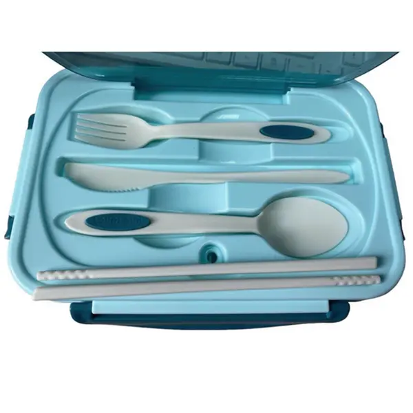 • Evőeszköz szett a fedélben: kanál, villa, kés és evőpálcika