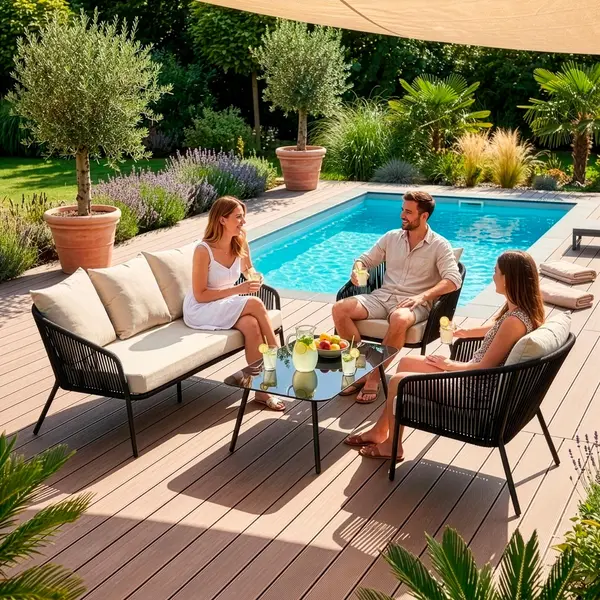 Riverstone kerti bútor szett – kényelmes, modern megjelenésű összeállítás teraszra, kertbe vagy erkélyre. A porszórt acél váz és a polimer kötélfonat stabil, időtálló alapot ad, a vastag párnák pedig kellemes pihenést biztosítanak.