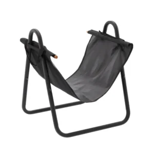 A fekete fém rönktartó állvány levehető, erős vászon hordozó táskával gondoskodik arról, hogy a nappaliban vagy a teraszon mindig kéznél legyen a száraz tűzifa, miközben a favágástól a kandallóig vezető úton is kényelmesen és tisztán szállíthatod a hasábokat.