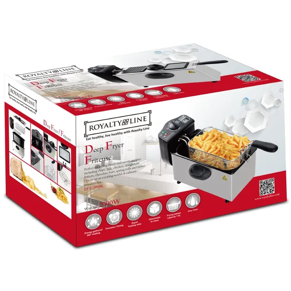 Royalty Line EFT-2000L 3 literes olajsütő ideális választás ropogós hasábburgonya, hal, csirke, fánk, tavaszi tekercs és más sós vagy édes finomságok elkészítéséhez. Praktikus kialakításával megkönnyíti a mindennapi sütést, miközben egyenletes hőmérsékletet és kényelmes használatot biztosít.