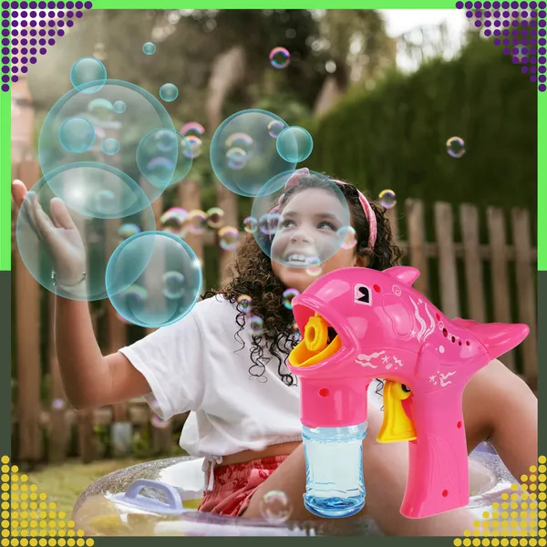 Varázsolj pillanatok alatt szivárványos buborékfelhőt ezzel a rózsaszín, delfin alakú buborékfújó pisztollyal, amely egyetlen gombnyomásra több száz buborékot fúj ki.