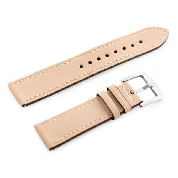 Rózsaszín, természetes bőrből készült óraszíj, fehér cérnás varrással és ezüstszínű fém csattal. Kényelmes viselet a mindennapokra, és egyszerűen feldobja az óra megjelenését.