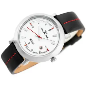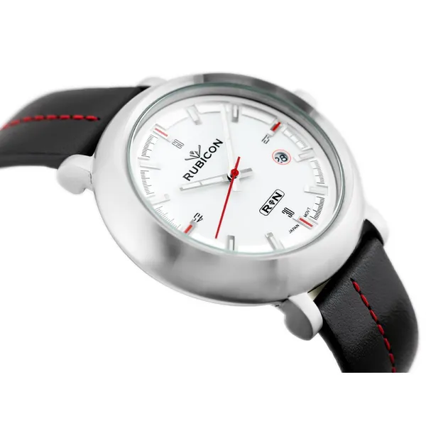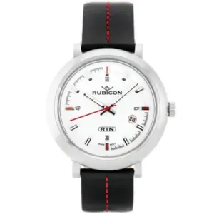Rubicon Arwena női karóra elegáns, karakteres megjelenést kínál a mindennapokra és alkalmi viselethez is. Az ezüst színű számlap, az ezüst tok, a fekete bőrszíj, valamint a piros varrás és a piros másodpercmutató különleges, mégis könnyen hordható összhatást teremt.