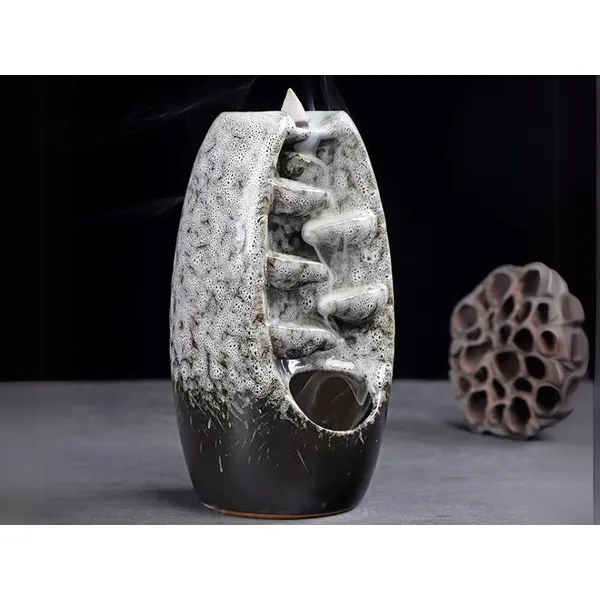 The elegant ceramic scented fireplace in the form of a waterfall is the perfect way to bring a relaxing atmosphere to your interior. Its unique design allows for a striking diffusion of smoke that flows down like a waterfall, creating a mesmerising and calming sight. It comes with 10 conical incense sticks (wicks) that release pleasant aromas, ideal for meditation, relaxation or aromatherapy.
