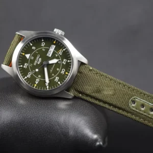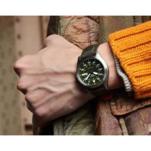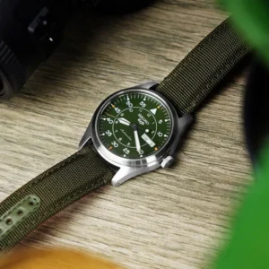 A 43 mm-es, 13 mm vastag, rozsdamentes acél tok karcálló, edzett ásványüveggel óvja a látványos, zöld számlapot. A 100 m vízállóság révén nyugodtan úszhatsz vagy snorkelezhetsz, míg a csavaros korona és a menetes hátlap extra védelmet ad a mechanikának.