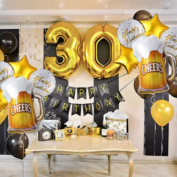 Látványos “CHEERS” söröskorsó, két Happy Birthday felirat és két arany csillag gondoskodik arról, hogy a buli már az ajtóban mosolyt csaljon a vendégek arcára. A strapabíró fólia lufik héliummal és levegővel is felfújhatók, percek alatt elkészül a dekoráció.