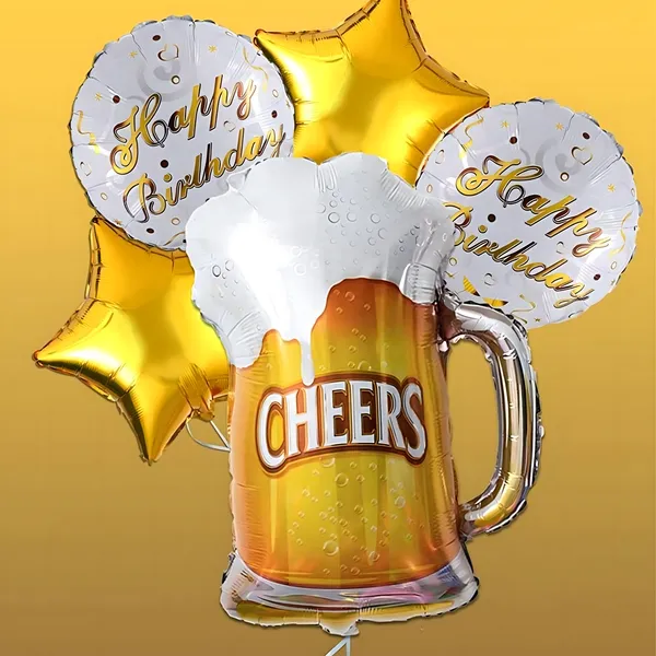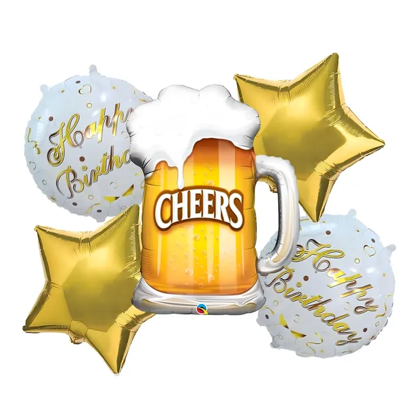 Ezzel az 5 darabos, látványos fólia lufi szettel pillanatok alatt valódi pub-hangulatot teremthetsz a születésnapi buliban vagy legénybúcsún. A középpontban egy nagy, “CHEERS” feliratú söröskorsó áll, melyhez két Happy Birthday feliratú, valamint két arany csillag formájú lufi tartozik.