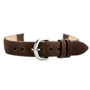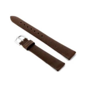 Valódi, sötétbarna marhabőrből készült óraszíj, amely 14 mm-es csatlakozásával illik a keskeny tokú karórákhoz. Az ezüstszínű rozsdamentes csat és a 7 állítólyuk kényelmes, tartós viselést biztosít.