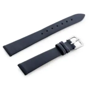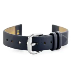 Sötétkék színű, természetes bőrből készült óraszíj, elegáns ezüstszínű fém csattal. Kényelmes viseletet és klasszikus megjelenést kínál, így ideális választás a mindennapi használathoz és alkalmi öltözékhez is.