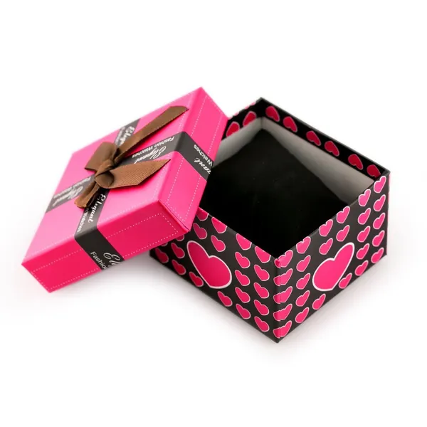 Szív alakú karton díszdoboz sötétrózsaszín és fekete színben, barna szalaggal díszítve.