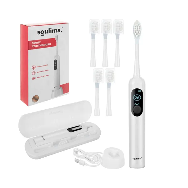 A Soulima X800 fehér szónikus fogkefe hatékony és kényelmes megoldás a mindennapi szájápoláshoz. Percenként akár 90 000 rezgéssel segít eltávolítani a lepedéket és a baktériumokat a nehezen elérhető helyekről is, miközben kíméletes marad az ínyhez.