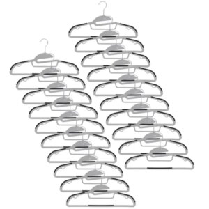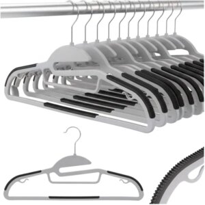 A 20 darabos, csúszásgátlós vállfa szett 5 kg teherbírásával és 360°-os fém akasztójával helyet takarít meg, miközben megóvja ruháidat a lecsúszástól. Keskeny profilja és integrált alsó rúdja ideális nadrágok, sálak és felsők rendezett tárolásához.