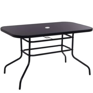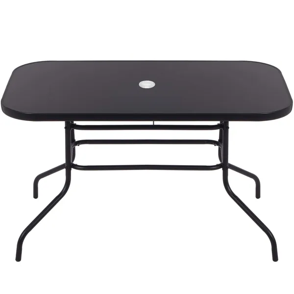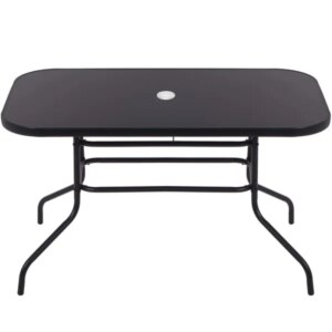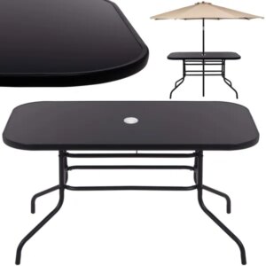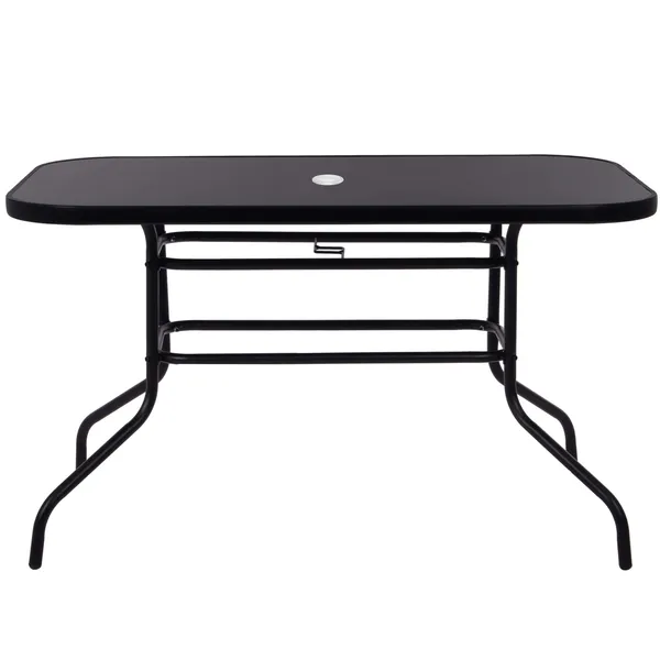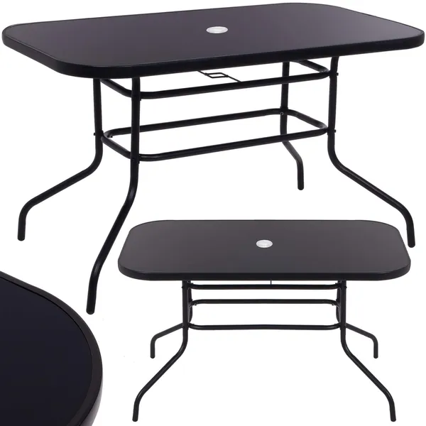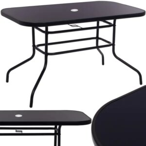 A Springos® kerti asztal elegáns, modern megjelenésével és stabil fém vázával ideális választás teraszra, kertbe vagy erkélyre. A fekete edzett üveg asztallap prémium hatást kelt, miközben könnyen tisztán tartható, a napernyő-nyílás pedig kényelmes megoldást kínál a nyári napokon.