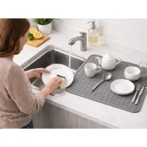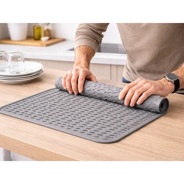Rendezettebb pult és gyorsabb száradás: a bordázott szilikon felület elvezeti a vizet, miközben védi a munkalapot a vízfoltoktól és karcoktól. Csúszásmentes, könnyen leöblíthető, és használat után feltekerhető vagy felakasztható, így kis helyen is kényelmesen elfér.