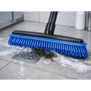 A beépített lehúzóval egyszerűen eltávolítható a víz, sár vagy hab – ideális fürdőszobába, konyhába, erkélyre vagy teraszra. A masszív, csavaros rögzítésű fém nyél kényelmes használatot és stabil fogást ad.