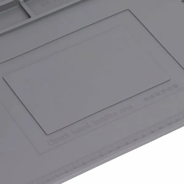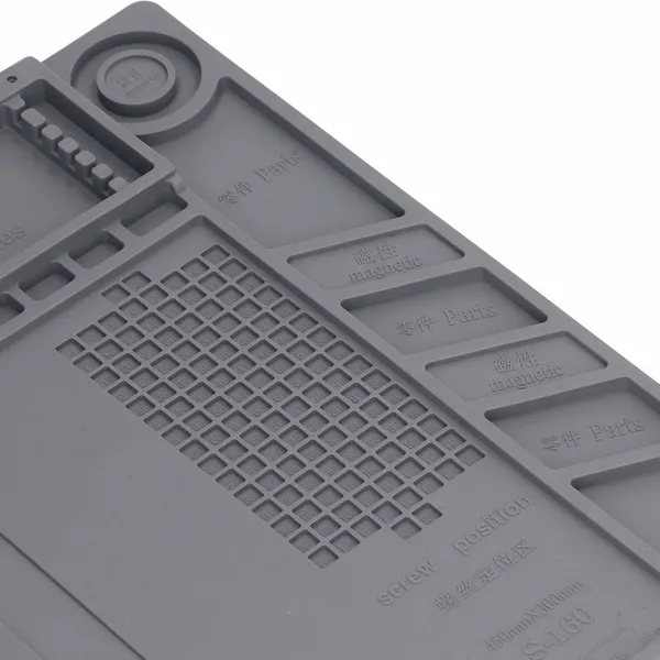 Ez a szürke szilikon szerviz alátét megkönnyíti a forrasztást és az elektronikai javításokat: rendezetten tartja a munkaterületet, miközben védi az asztallapot a hőtől és a szennyeződésektől. A nagy, kényelmes fő munkafelület mellett több rekesz és mágneses zóna segít a csavarok, bitek és apró alkatrészek rendszerezésében. Az alján található mérőskála gyors mérésekhez is praktikus.