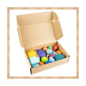 Színes, fa építőkockák 16 darabos készletben, amelyek kreatív építésre és tartalmas közös játékra ösztönöznek. A változatos formák segítik a finommotorika, a koncentráció és a logikus gondolkodás fejlődését, miközben könnyen rendben tarthatók a kompakt dobozban.