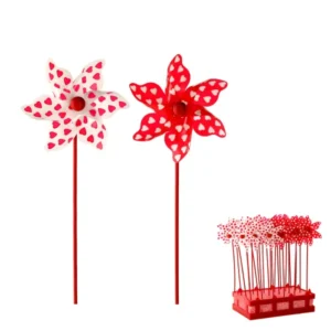 Szív mintás szélforgónk romantikus hangulatot és játékos mozgást visz kertedbe: tartós PVC lapátokkal és stabil bambusz szárral készül, így hosszú ideig élvezheted a szélben forgó színes látványt.