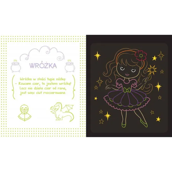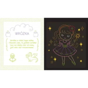 A fekete borítású oldalak minden egyes vonásra káprázatos, szivárványos hátteret tárnak fel, így a kicsik varázspálcaként használhatják a mellékelt műanyag stylust, miközben saját történeteiket rajzolják meg.