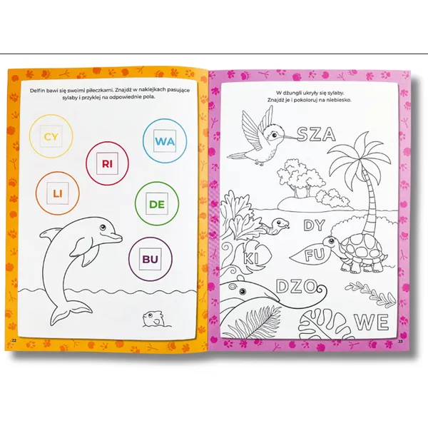 A kötetben szép, színezhető illusztrációk és egyszerű, óvodás korosztálynak megfelelő tevékenységek várnak. A gyerekek megismerkednek az erdő, a dzsungel és a szavanna lakóival, miközben játék közben erősítik a szótagfelismerést.