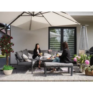 A porszórt alumínium váz és a 10 cm vastag, levehető párnák hosszú távon is strapabíró, kényelmes pihenőhelyet garantálnak. A magasságállítható asztal és a többfunkciós puff révén a garnitúra pillanatok alatt alkalmazkodik a társasági vagy étkezési igényekhez.