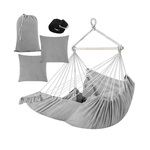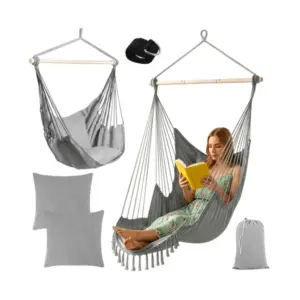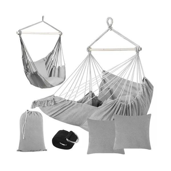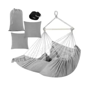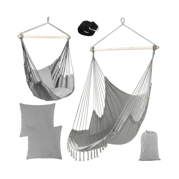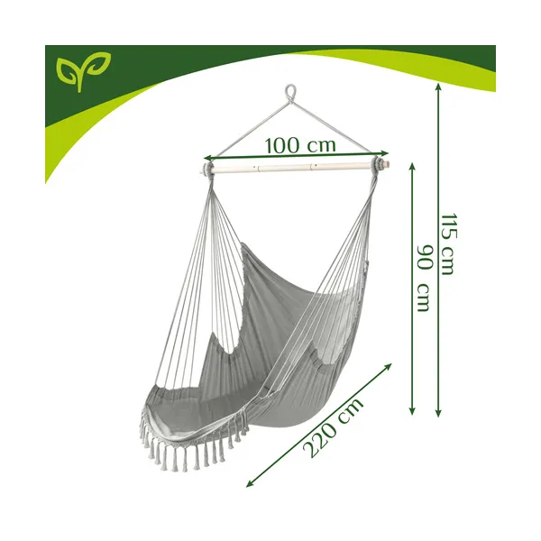 Alakíts ki pillanatok alatt kényelmes pihenősarkot a kertben, erkélyen vagy akár a nappaliban. Ez a szürke, bohém hangulatú függő fotel puha, ölelő pamutszövettel és két kényelmes párnával segít ellazulni olvasáshoz, sziesztához vagy egy nyugodt esti ringatózáshoz.