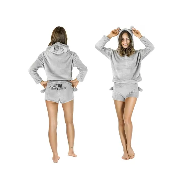Szürke kapucnis női plüss pizsama szett hosszú ujjú felsővel, rövidnadrággal L