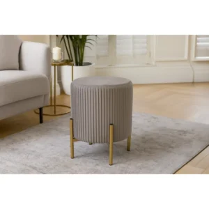 Tedd otthonod még stílusosabbá ezzel a kompakt, szürke, kerek puffal, amely aranyszínű fém lábaival és puha velúr kárpitjával azonnal luxushangulatot teremt. A 28 cm-es átmérő és 42 cm-es magasság ideálissá teszi ülőkének, lábtartónak vagy dekoratív kiegészítőnek bármely helyiségben – a nappalitól a hálószobáig.