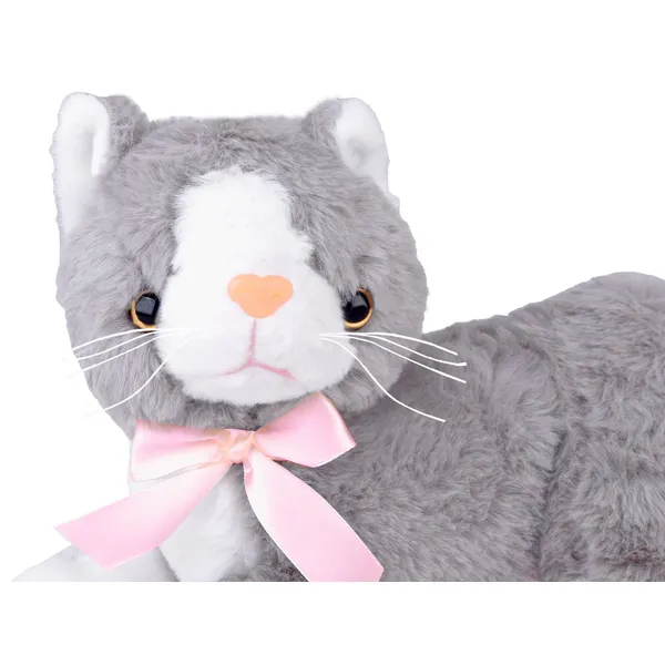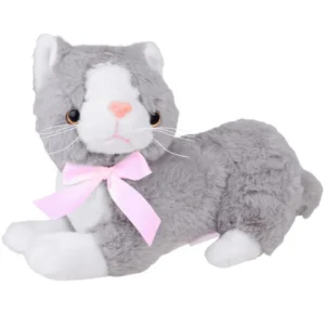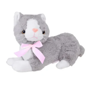 Pihe-puha szürke plüss cica, amely 34 cm-es méretével ideális ölelgetni, és elegáns masnijával igazi dísze a gyerekszobának. Biztonságos kialakítása és tartós anyaga révén hű társa lesz a mindennapi játékoknak és az esti elalváshoz.