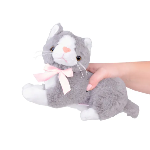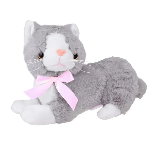 Ki ne vágyna egy doromboló, puha kiscicára? Ha az élő kedvenc még várat magára, ez a szürke, fekvő plüss cica tökéletes alternatíva: finom tapintású plüssanyagból készült, csillogó műanyag szemekkel, rózsaszín orrocskával és elegáns, szatén masnival.