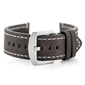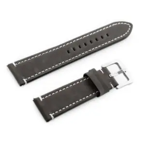 Szürke színű, természetes bőrből készült óraszíj, elegáns fehér varrással és ezüstszínű fém csattal. Kényelmes viseletet és klasszikus megjelenést kínál a mindennapi használathoz.