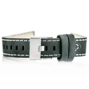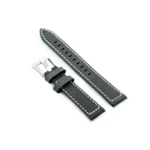 Szürke színű, természetes bőrből készült óraszíj elegáns fehér varrással és ezüstszínű fém csattal. Kényelmes viseletet és klasszikus megjelenést biztosít a mindennapi használathoz.