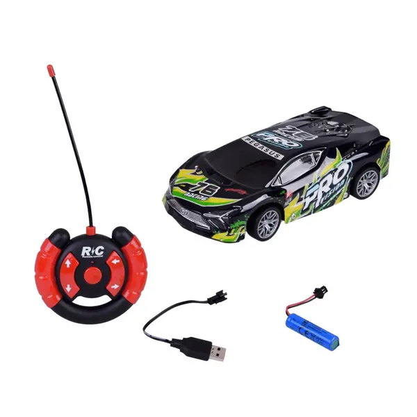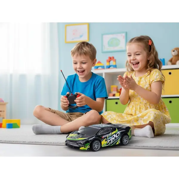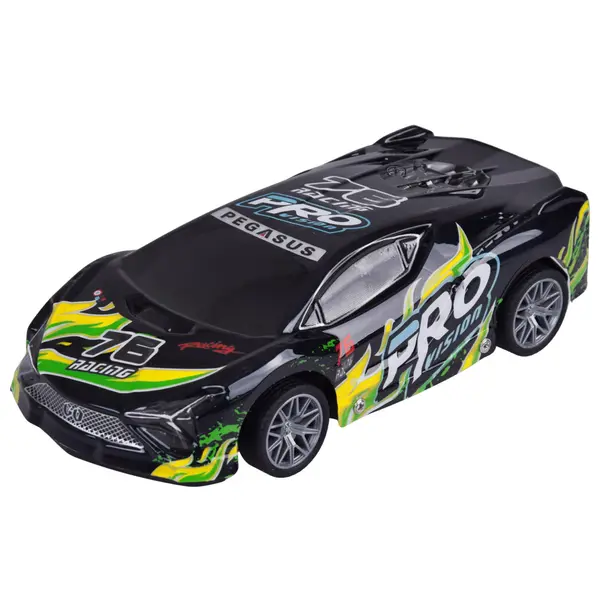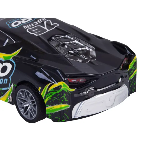 Ez a távirányítós sportautó remek választás a gyors autók és az izgalmas játék kedvelőinek. Könnyű, ugyanakkor sérülésálló fekete műanyag karosszériát kapott, színes feliratokkal a dinamikus, sportos megjelenésért. Menet közben a karosszéria látványosan világít és villog, így szürkületben is különösen mutatós.