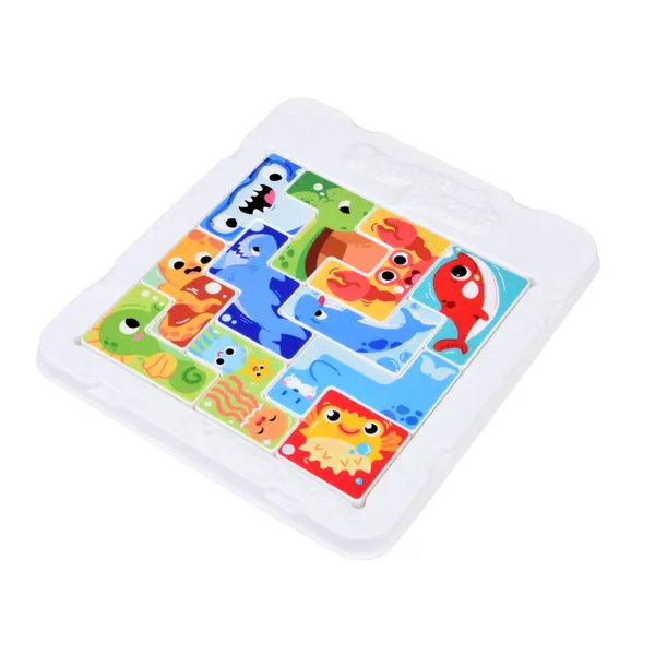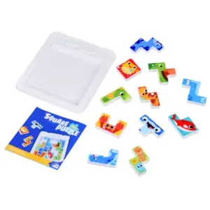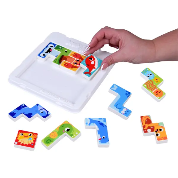 Ez a tengeri állatokkal díszített, vidám színű kirakó remek elfoglaltság a legkisebbeknek: tanulás és kreatív játék egyben. A gyermek feladata, hogy a geometrikus elemeket úgy illessze a táblára, hogy minden darab pontosan kitöltse a helyét, és végül egy teljes négyzet álljon össze. A cuki tengeri figurák még vonzóbbá és élvezetesebbé teszik a játékot.