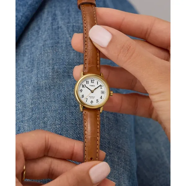 A Timex Easy Reader T2J761 egy elegáns, mégis praktikus női karóra, amely tökéletes választás a mindennapokra és alkalmakra is. A fehér számlap jól olvasható, fekete számokkal készült, a megjelenést pedig a aranyszínű acél tok és a barna valódi bőrszíj teszi kifinomulttá.