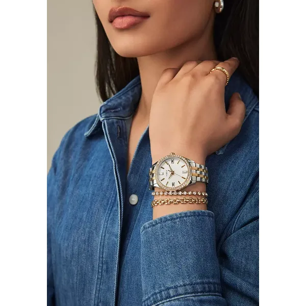 Elegáns, két tónusú (ezüst–arany) acél női karóra fehér, könnyen leolvasható számlappal, dátum- és napkijelzéssel. A megbízható kvarc szerkezet és a strapabíró ásványüveg ideális választássá teszi mindennapi viselethez és alkalmakra is.