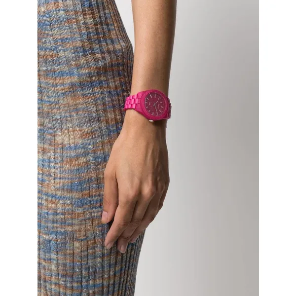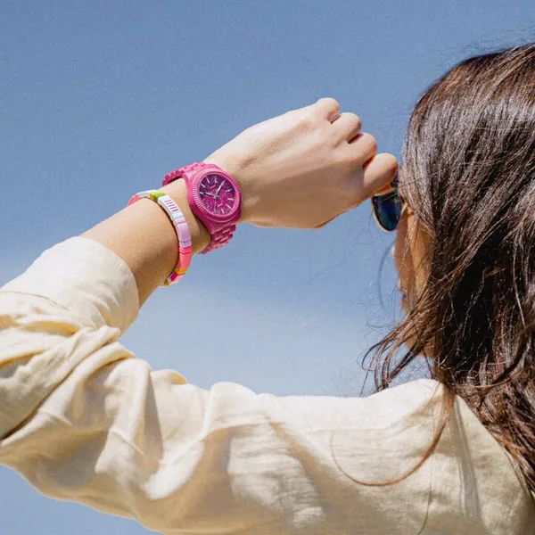 • Színvilág: rózsaszín számlap, rózsaszín tok és szíj, ezüst színű indexek